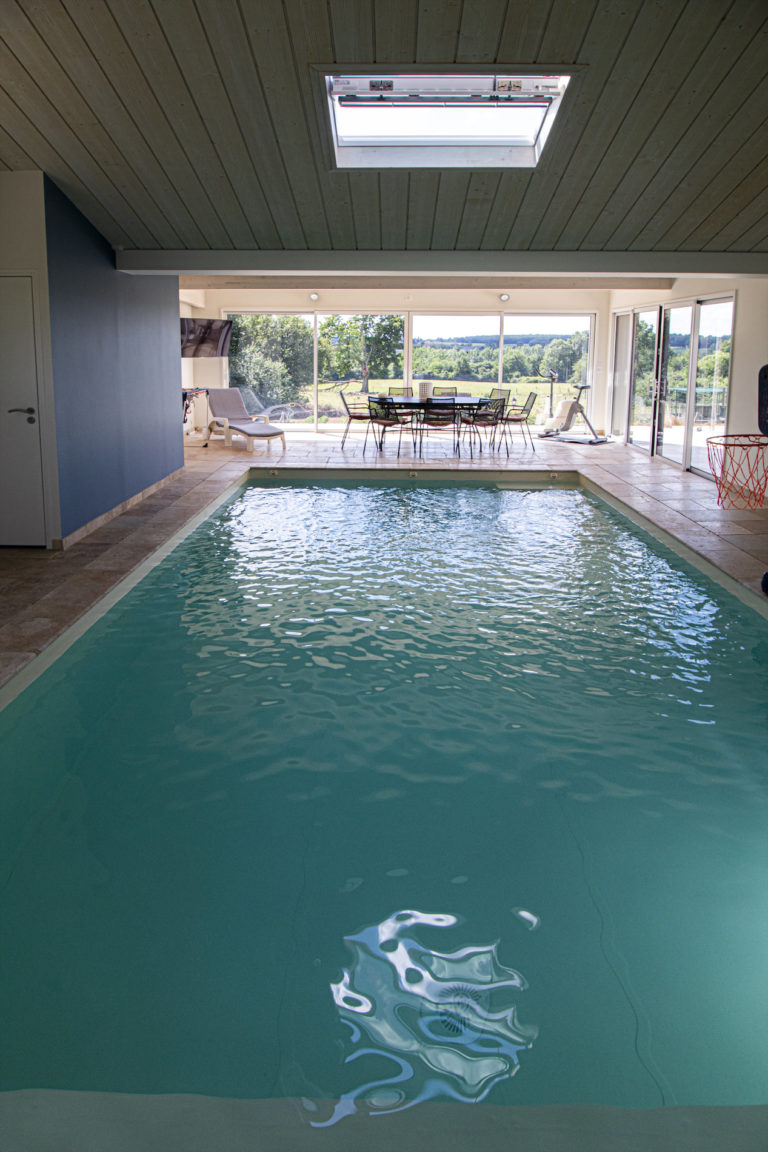 Réalisation d’une extension pour piscine intérieure à Lys-Haut-Layon (49) en 2021. Cette extension lumineuse correspond parfaitement aux demandes des clients. Elle épouse parfaitement les lignes de la piscine.