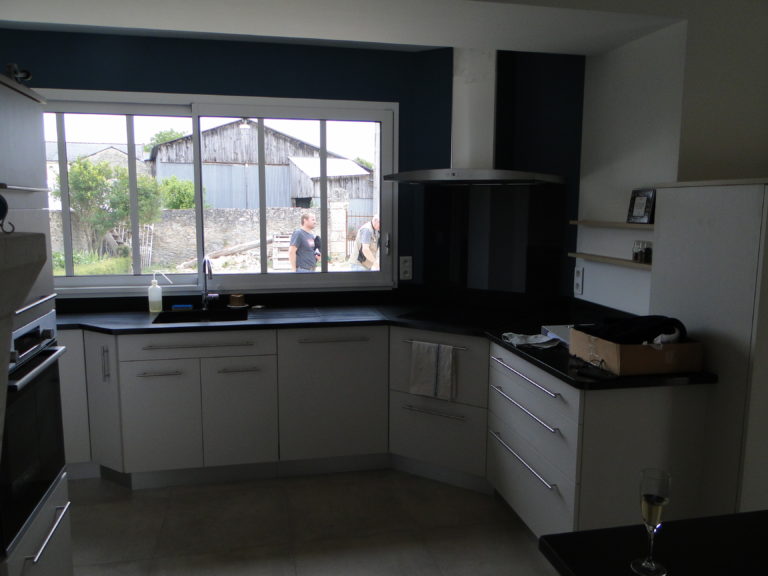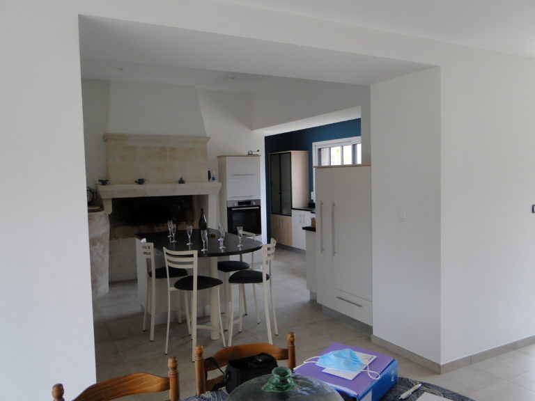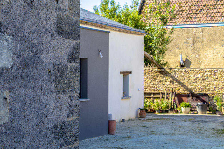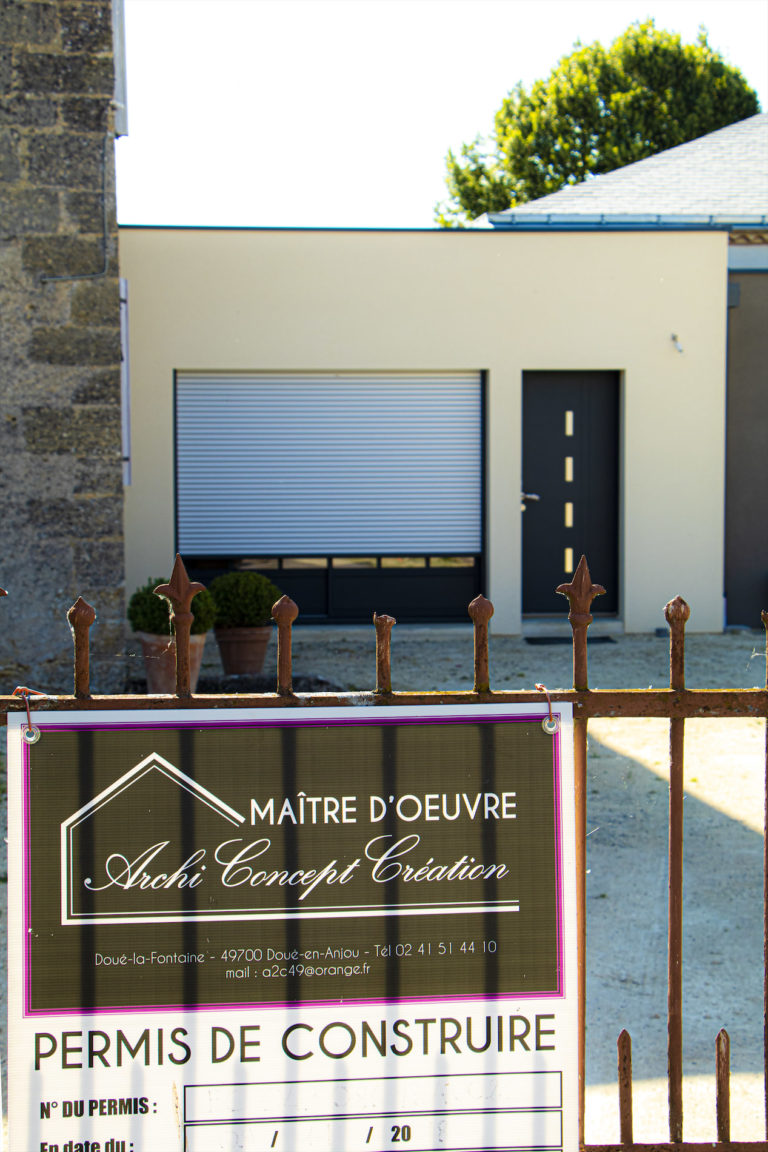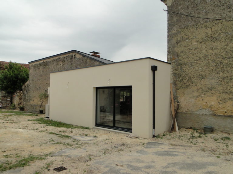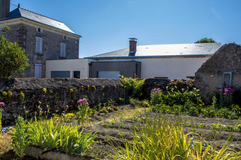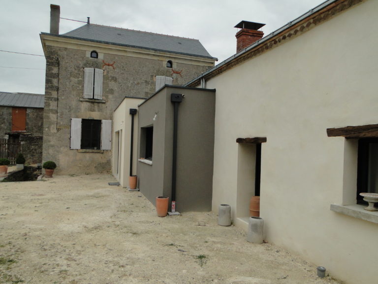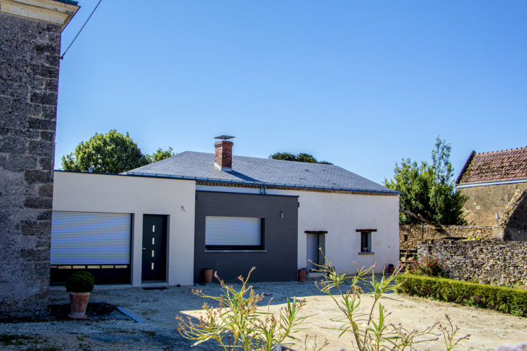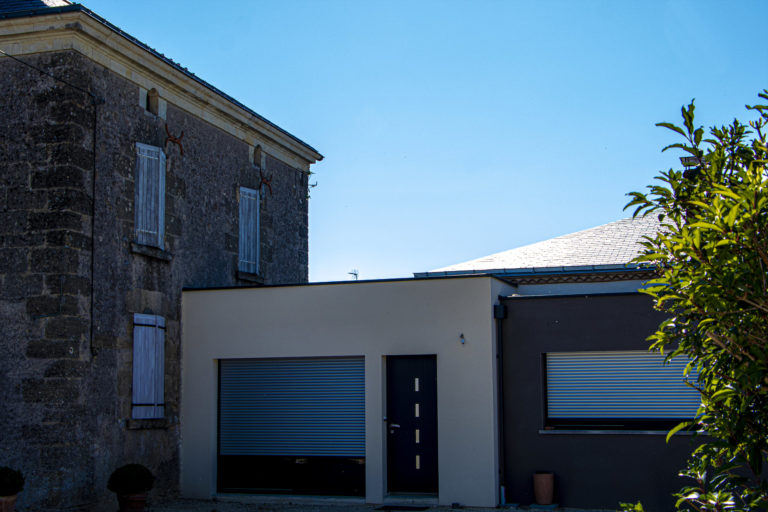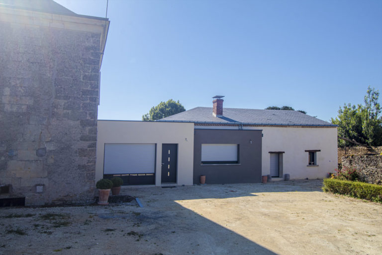 Extension de maison sur bâti ancien à Terranjou (49) en  2022. Extension moderne qui tranche avec le charme de l’ancien.